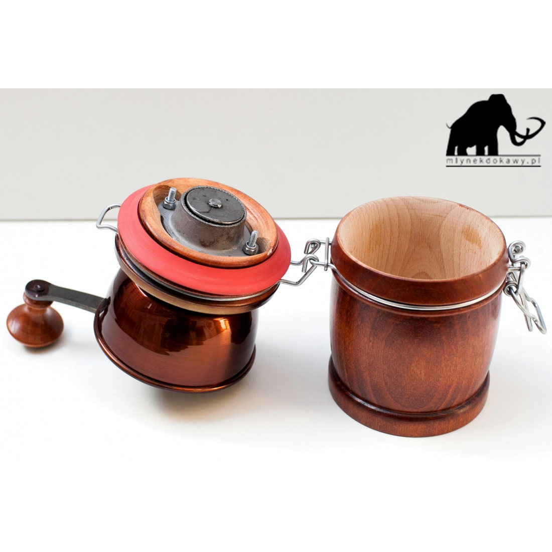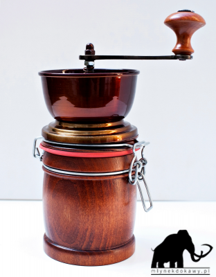Korpus młynka w kolorze cygaro brazylijskie, wykonany z lakierowanego olchowego lub bukowego drewna pokrytego bejcą rustykalną. Żarna odlewane ze staliwa metodą traconego wosku (zobacz). Pozostałe elementy wykonane ze stopów metali, patynowane, pokryte powłoką galwaniczną. Ręcznie wyoblany kielich z blachy głębokotłocznej. Płynna regulacja mielenia (zobacz).